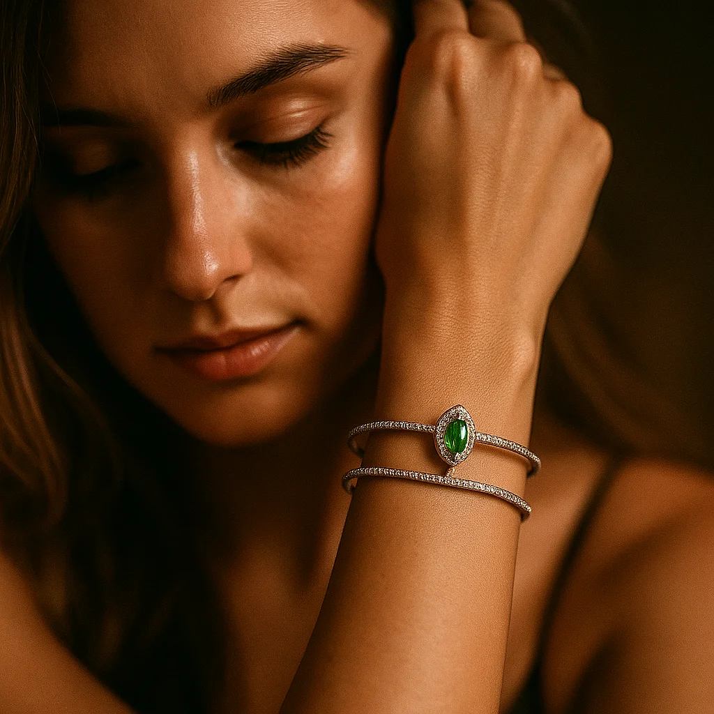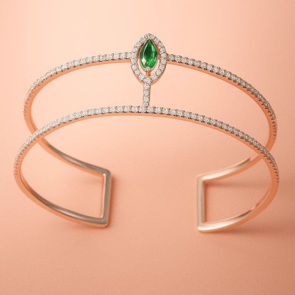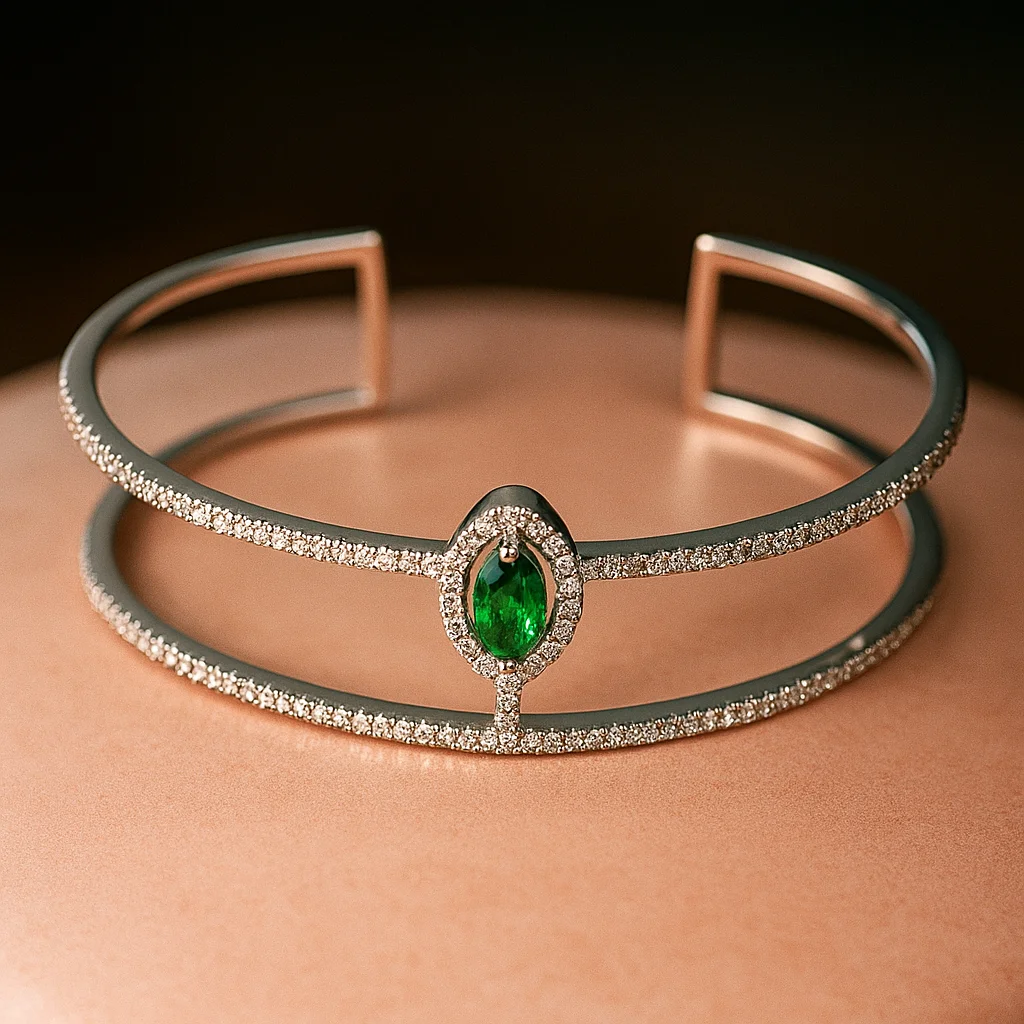 El Brazalete Enma combina elegancia y sofisticación en un diseño doble con destellos de circonias y un brillante detalle central en verde esmeralda, ideal para realzar cualquier look con un toque exclusivo.